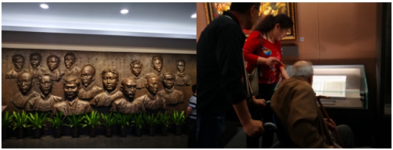 走進(jìn)"一大"會(huì)址,首先映入眼簾的是13位中共代表及2位共產(chǎn)國(guó)際代表銅頭像。他們是毛澤東、何叔衡、董必武、陳潭秋、王盡美、鄧恩銘、李達(dá)、李漢俊、張國(guó)燾、劉仁靜、陳公博、周佛海、包惠僧及荷蘭人馬林和俄羅斯人尼柯?tīng)査够?,左手邊是巨幅黨旗,重溫入黨誓詞,激情澎湃,激蕩回響。忽然,我看見(jiàn)一位老人坐著輪椅被推到成列窗前,旁邊的女子大聲給老人講解并手指相片,可能老人耳朵聽(tīng)不清,久久凝視,用顫抖的右手撫摸著放照片的成列窗玻璃,張張嘴,笑了。這一場(chǎng)景我的心顫了,我看到老人眼里含著淚笑,而我卻哭了……
