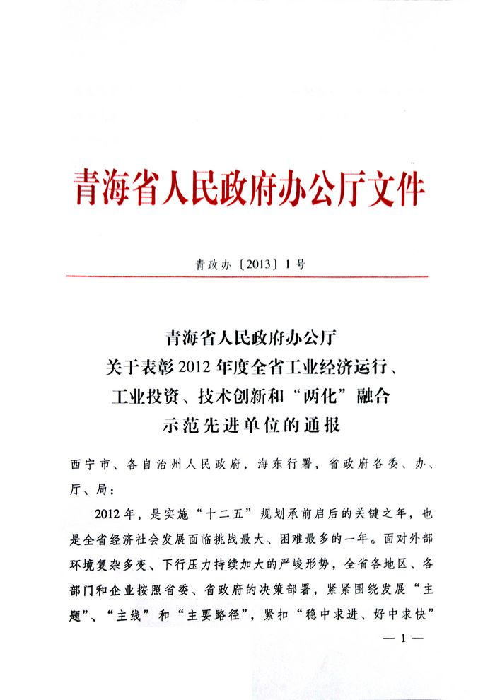 2012年,青海省物產(chǎn)集團(tuán)總公司在省委、省政府及省國資委的大力支持和領(lǐng)導(dǎo)下,集團(tuán)總公司按照全省工業(yè)經(jīng)濟(jì)總體部署和要求,著力推進(jìn)工業(yè)項(xiàng)目建設(shè),榮獲"2012年度工業(yè)投資貢獻(xiàn)獎"。